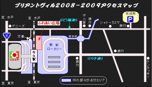2008年12月6日(土)から2009年1月31日(土)までの毎日16:00から25:00まで、JR牛久駅周辺がイルミネーション点灯されます。