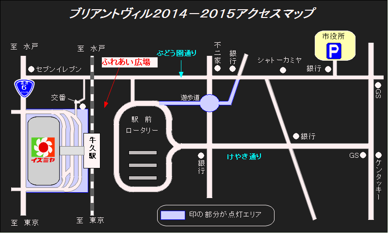2014年11月29日(土)から2015年3月24日(火)までの毎日17:00からJR牛久駅周辺がイルミネーション点灯されます。