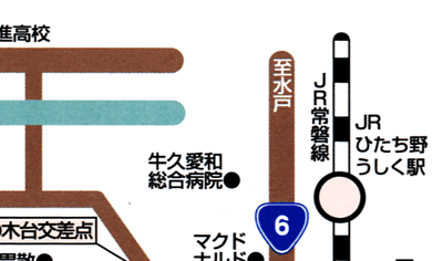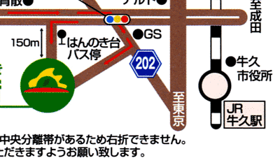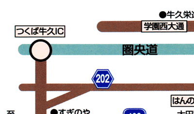 常磐自動車道つくばJCT経由圏央道つくば牛久ICを下りて牛久・成田方面へ向かい国道408号との十字路(大井北交差点)を左折、約2.5kmで到着(つくば牛久ICからの所要時間は約5分です)