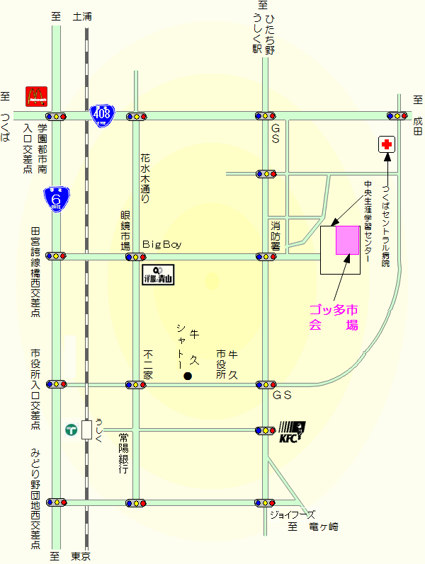 うしくゴッ多市の会場は、牛久市中央生涯学習センターの駐車場になります。