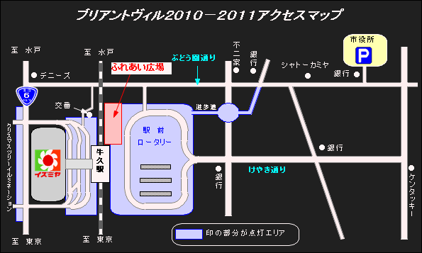 2010年12月18日(土)から2011年2月14日(月)までの毎日17:00から25:00まで、JR牛久駅周辺がイルミネーション点灯されます。